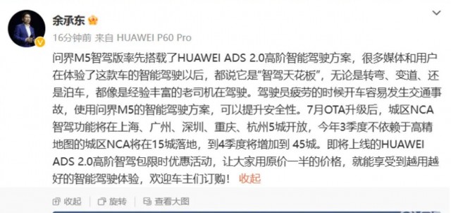 6月29日消息,电车之家了解到华为余承东发布微博表示,问界M5智驾版率先搭载了HUAWEI ADS 2.0高阶智能驾驶方案,很多媒体和用户在体验了这款车的智能驾驶以后,都说它是”智驾天花板”,无论是转弯、变道、还是泊车,都像是经验丰富的老司机在驾驶。驾驶员疲劳的时候开车容易发生交通事故,使用问界M5的智能驾驶方案,可以提升安全性。7月OTA升级后,城区NCA 智驾功能将在上海、广州、深圳 重庆、杭州5城开放,今年3季度不依赖于高精地图的城区NCA将在15城落地,到4季度将增加到 45城。即将上线的HUAWEIADS 2.0高阶智驾包限时优惠活动,让大家用原价一半的价格,就能享受到越用越好的智能驾驶体验,欢迎车主们订购!